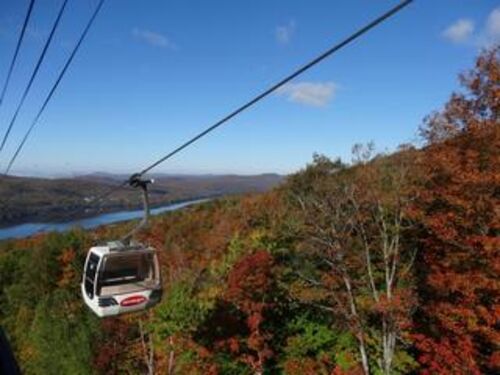 ロレンシャン高原の中でも一番のリゾート地、モン・トランブランにやってきました~。 夏は避暑地、冬はゲレンデとして大人気の場所ですが、日本では秋の紅葉の季節に訪れるツアーが多いようです。 低い地点と高い地点を結ぶ無料のゴンドラ。 ホテルの真上を…
