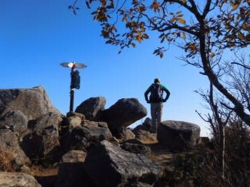 物見岩に到着です。 恵那山をはじめ、南アルプス方面が見渡せる絶景です。 少し離れた位置にある、富士見岩。 天気がよければ富士山が見える??? 笠置神社奥社に到着。 お決まりの三角点(笠置山山頂1128m)で記念撮影。 さらに奥に進んでいくと・・…